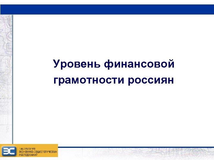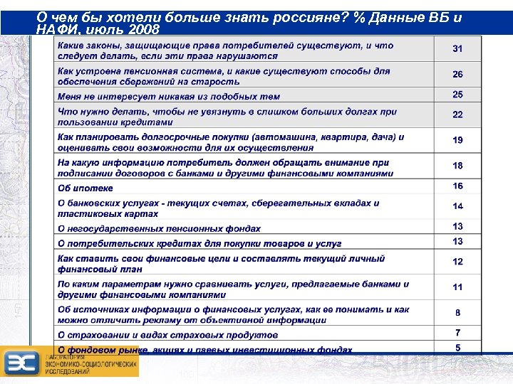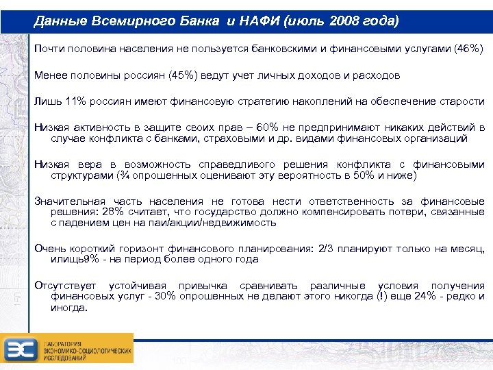 Данные Всемирного Банка и НАФИ (июль 2008 года) Почти половина населения не пользуется банковскими и финансовыми услугами (46%) Менее половины россиян (45%) ведут учет личных доходов и расходов Лишь 11% россиян имеют финансовую стратегию накоплений на обеспечение старости Низкая активность в защите своих прав – 60% не предпринимают никаких действий в случае конфликта с банками, страховыми и др. видами финансовых организаций Низкая вера в возможность справедливого решения конфликта с финансовыми структурами (¾ опрошенных оценивают эту вероятность в 50% и ниже) Значительная часть населения не готова нести ответственность за финансовые решения: 28% считает, что государство должно компенсировать потери, связанные с падением цен на паи/акции/недвижимость Очень короткий горизонт финансового планирования: 2/3 планируют только на месяц, илищь9% - на период более одного года Отсутствует устойчивая привычка сравнивать различные условия получения финансовых услуг - 30% опрошенных не делают этого никогда (!) еще 24% - редко и иногда.