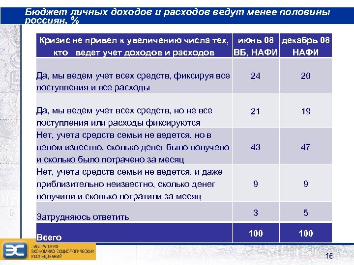 Бюджет личных доходов и расходов ведут менее половины россиян, % Кризис не привел к увеличению числа тех, июнь 08 декабрь 08 кто ведет учет доходов и расходов ВБ, НАФИ Да, мы ведем учет всех средств, фиксируя все поступления и все расходы 24 20 Да, мы ведем учет всех средств, но не все поступления или расходы фиксируются Нет, учета средств семьи не ведется, но в целом известно, сколько денег было получено и сколько было потрачено за месяц Нет, учета средств семьи не ведется, и даже приблизительно неизвестно, сколько денег получили и сколько потратили за месяц 21 19 43 47 9 9 Затрудняюсь ответить 3 5 100 Всего 16