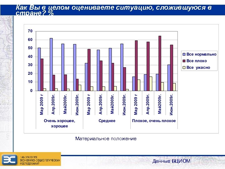 Как Вы в целом оцениваете ситуацию, сложившуюся в стране? % Материальное положение Данные ВЦИОМ