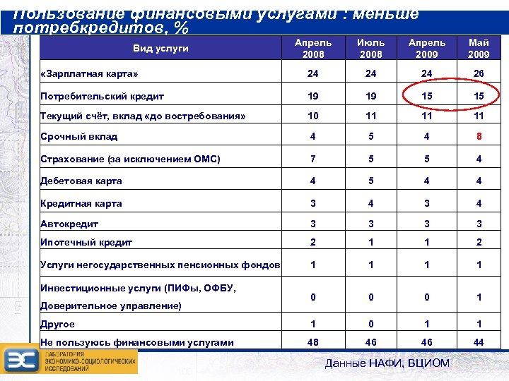 Пользование финансовыми услугами : меньше потребкредитов, % Апрель 2008 Июль 2008 Апрель 2009 Май 2009 «Зарплатная карта» 24 24 24 26 Потребительский кредит 19 19 15 15 Текущий счёт, вклад «до востребования» 10 11 11 11 Срочный вклад 4 5 4 8 Страхование (за исключением ОМС) 7 5 5 4 Дебетовая карта 4 5 4 4 Кредитная карта 3 4 Автокредит 3 3 Ипотечный кредит 2 1 1 2 Услуги негосударственных пенсионных фондов 1 1 0 0 0 1 Другое 1 0 1 1 Не пользуюсь финансовыми услугами 48 46 46 44 Вид услуги Инвестиционные услуги (ПИФы, ОФБУ, Доверительное управление) Данные НАФИ, ВЦИОМ