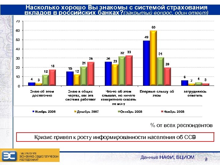 Насколько хорошо Вы знакомы с системой страхования вкладов в российских банках? (закрытый вопрос, один ответ) % от всех респондентов Кризис привел к росту информированности населения об ССВ Данные НАФИ, ВЦИОМ 9
