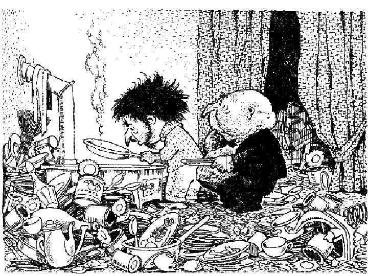 В доме у него был, как говорится, свинушник, так как наводить чистоту теперь было некому, а самому Спрутсу было лень работать щеткой и шваброй. К тому же он не любил мыть посуду. Позавтракав, пообедав или поужинав, он ставил грязную посуду куда-нибудь на пол в угол, а на следующий день брал из шкафа чистую посуду. Поскольку посуды у него было много, то все углы скоро были завалены грязными чашками, блюдцами и стаканами, ложками, вилками и ножами, тарелками, мисками, соусницами, чайниками, кофейниками, молочниками, салатницами, графинами, старыми консервными банками и бутылками разных форм и размеров. На столах, на подоконниках и даже на стульях громоздились покрытые сажей горшки, чугунки, кастрюли, судки, котелки, противни, сковородки с остатками испорченных блюд. На полу всюду валялись лимонные и апельсинные корки, банановая кожура, яичная и ореховая скорлупа, обрывки бумаги, пустые пакеты, засохшие и покрытые зеленоватой плесенью хлебные корки, яблочные огрызки, куриные кости, селедочные хвосты и головки. Нужно сказать, что эти хвосты и головки и даже целые рыбьи скелеты можно было увидеть не только на полу, но и на стульях, столах, шкафах, подоконниках, книжных полках, а также на спинках диванов и кресел.