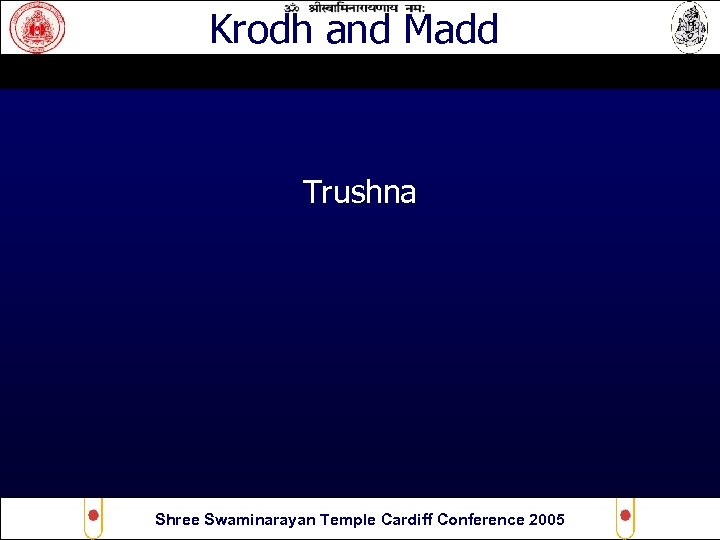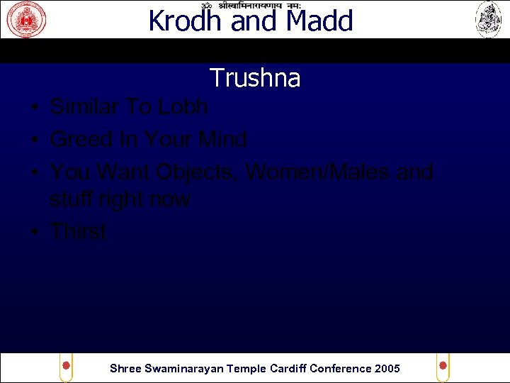 Krodh and Madd Trushna • Similar To Lobh • Greed In Your Mind • You Want Objects, Women/Males and stuff right now • Thirst Shree Swaminarayan Temple Cardiff Conference 2005