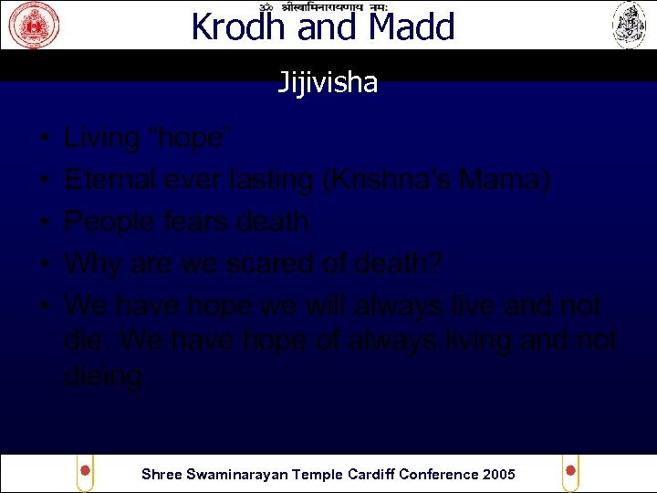 Krodh and Madd Jijivisha • • • Living “hope” Eternal ever lasting (Krishna's Mama) People fears death Why are we scared of death? We have hope we will always live and not die. We have hope of always living and not dieing Shree Swaminarayan Temple Cardiff Conference 2005