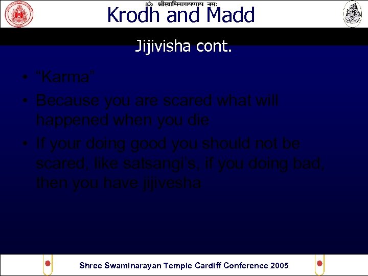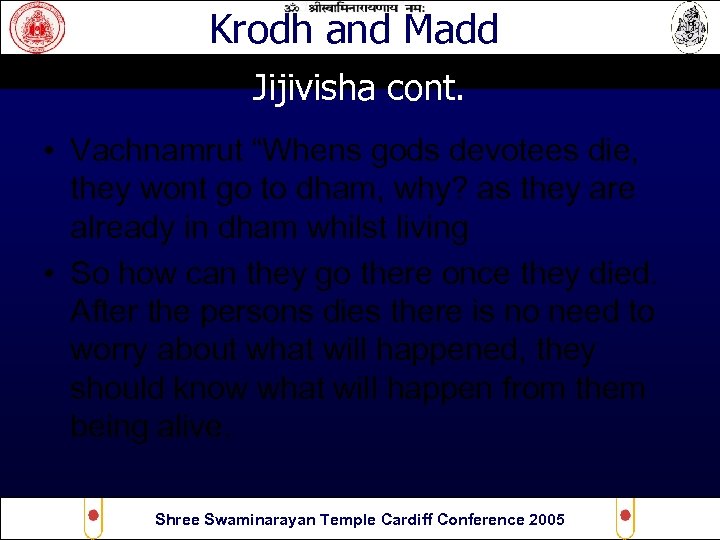 Krodh and Madd Jijivisha cont. • “Karma” • Because you are scared what will happened when you die • If your doing good you should not be scared, like satsangi’s, if you doing bad, then you have jijivesha Shree Swaminarayan Temple Cardiff Conference 2005