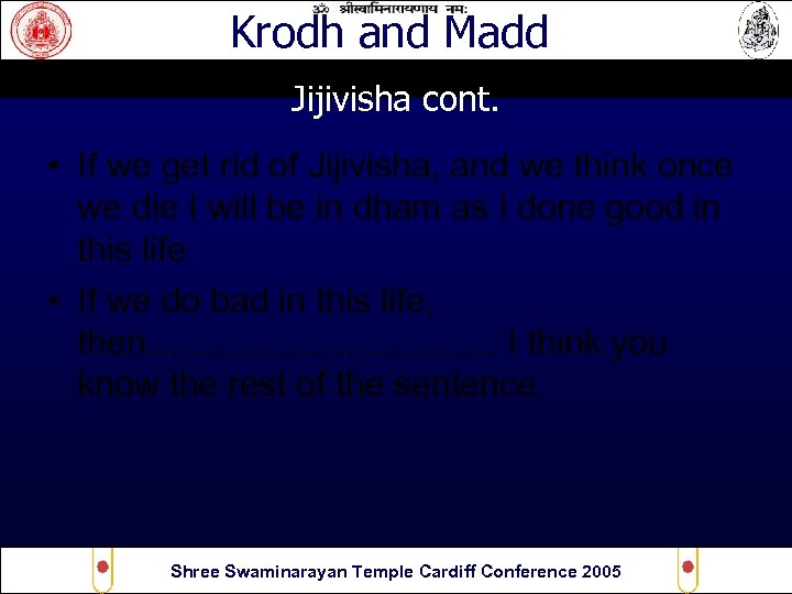 Krodh and Madd Jijivisha cont. • If we get rid of Jijivisha, and we think once we die I will be in dham as I done good in this life • If we do bad in this life, then…………… I think you know the rest of the sentence. Shree Swaminarayan Temple Cardiff Conference 2005