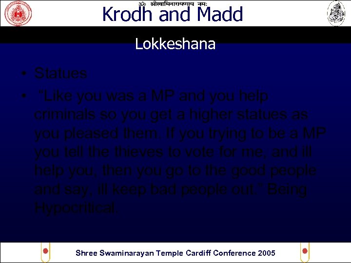 Krodh and Madd Lokkeshana • Statues • “Like you was a MP and you help criminals so you get a higher statues as you pleased them. If you trying to be a MP you tell the thieves to vote for me, and ill help you, then you go to the good people and say, ill keep bad people out. ” Being Hypocritical. Shree Swaminarayan Temple Cardiff Conference 2005