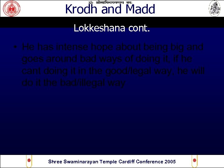 Krodh and Madd Lokkeshana cont. • He has intense hope about being big and goes around bad ways of doing it, if he cant doing it in the good/legal way, he will do it the bad/illegal way Shree Swaminarayan Temple Cardiff Conference 2005