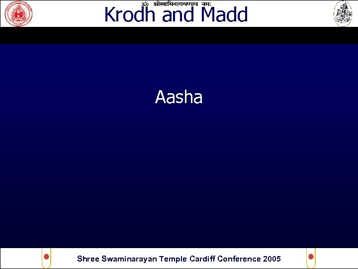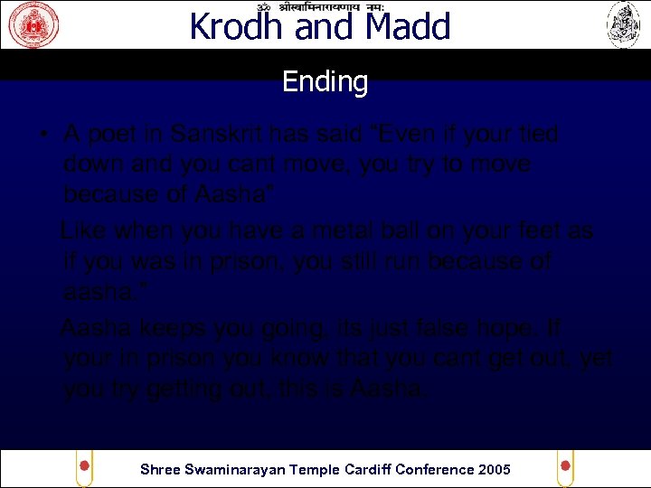 Krodh and Madd Ending • A poet in Sanskrit has said “Even if your tied down and you cant move, you try to move because of Aasha” Like when you have a metal ball on your feet as if you was in prison, you still run because of aasha. ” Aasha keeps you going, its just false hope. If your in prison you know that you cant get out, yet you try getting out, this is Aasha. Shree Swaminarayan Temple Cardiff Conference 2005