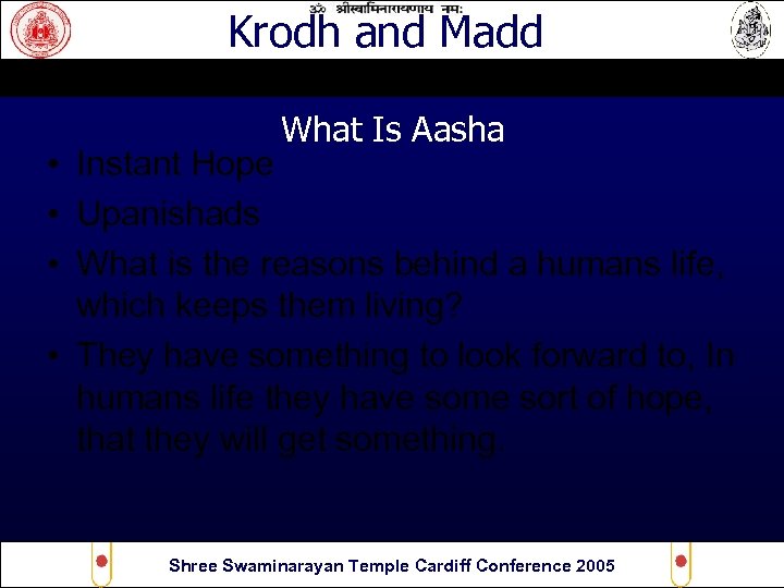Krodh and Madd What Is Aasha • Instant Hope • Upanishads • What is the reasons behind a humans life, which keeps them living? • They have something to look forward to, In humans life they have some sort of hope, that they will get something. Shree Swaminarayan Temple Cardiff Conference 2005