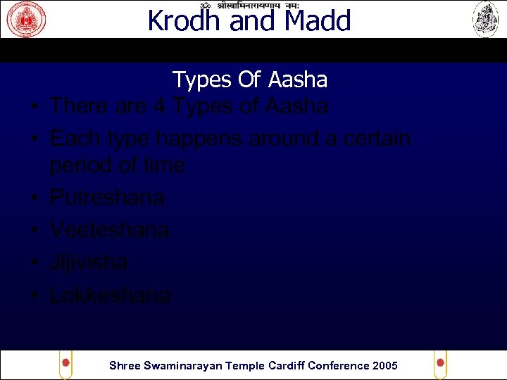 Krodh and Madd • • • Types Of Aasha There are 4 Types of Aasha Each type happens around a certain period of time Putreshana Veeteshana Jijivisha Lokkeshana Shree Swaminarayan Temple Cardiff Conference 2005