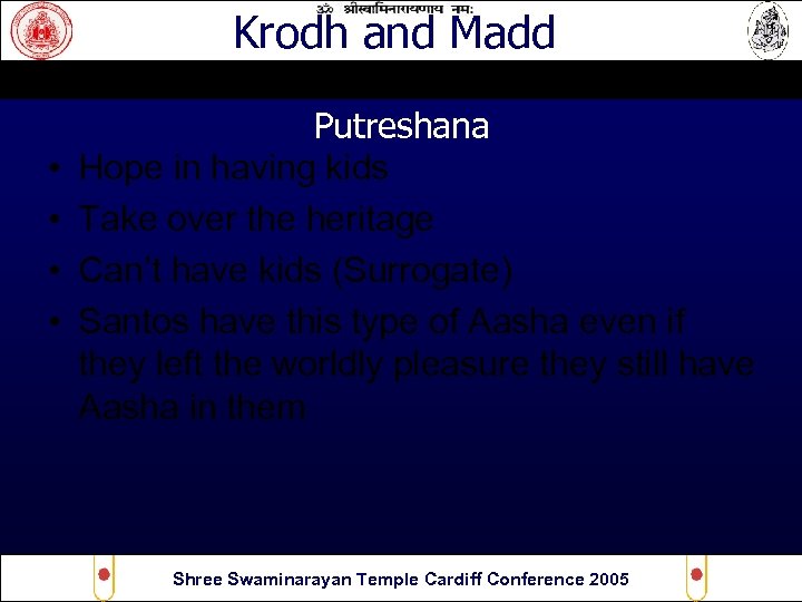 Krodh and Madd • • Putreshana Hope in having kids Take over the heritage Can’t have kids (Surrogate) Santos have this type of Aasha even if they left the worldly pleasure they still have Aasha in them Shree Swaminarayan Temple Cardiff Conference 2005
