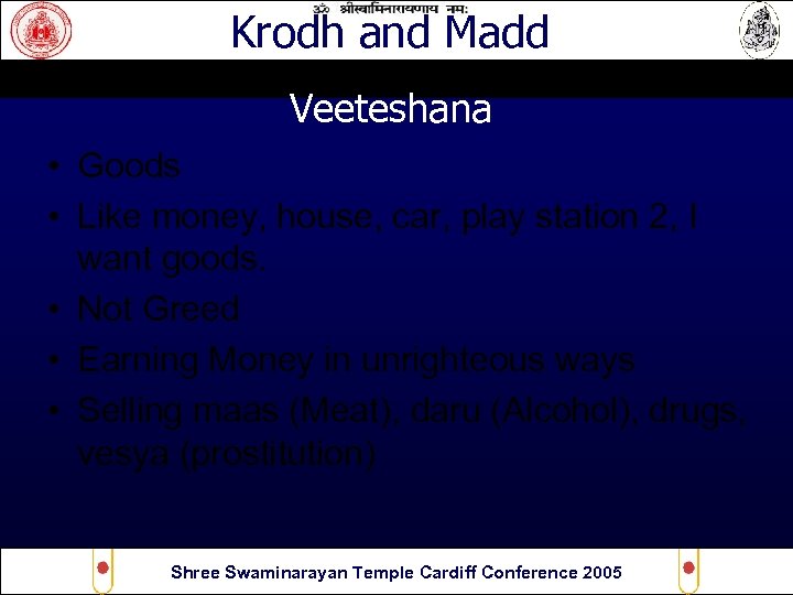 Krodh and Madd Veeteshana • Goods • Like money, house, car, play station 2, I want goods. • Not Greed • Earning Money in unrighteous ways • Selling maas (Meat), daru (Alcohol), drugs, vesya (prostitution) Shree Swaminarayan Temple Cardiff Conference 2005
