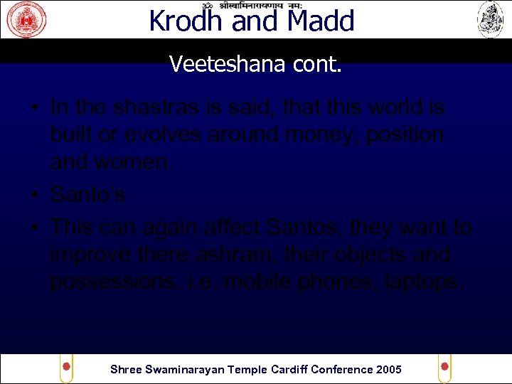 Krodh and Madd Veeteshana cont. • In the shastras is said, that this world is built or evolves around money, position and women. • Santo’s • This can again affect Santos, they want to improve there ashram, their objects and possessions. i. e. mobile phones, laptops. Shree Swaminarayan Temple Cardiff Conference 2005
