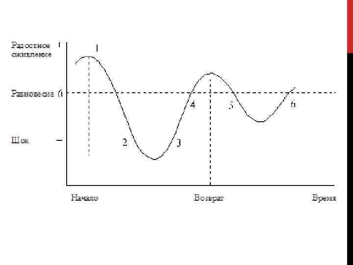 Нормальный цикл КШ распадается на четыре фазы. Иногда исследователи выделяют еще одну фазу, которую называют реверсивный КШ. 1 фаза – «Радостное оживление» . Эту фазу КШ переживают люди в течение первых недель, а иногда и месяцев после приезда в незнакомую страну (обычно 68 недель). Общие ощущения – волнения, временный цейтнот (недостаток времени), паника завершена. Регистрация, первое знакомство с местным населением и т. д. Туристы и бизнесмены в командировках переживают только одну фазу КШ – фазу «Радостного оживления» .