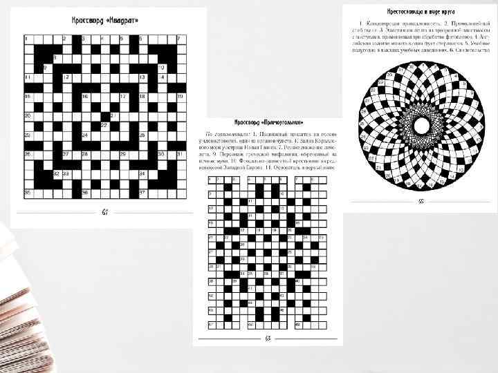 Классификация кроссвордов • кроссворд-прямоугольник; По форме • кроссворд-квадрат; • кроссворд-ромб; • кроссворд-треугольник; • сотовый кроссворд • круглый (циклический) кроссворд и т. д.