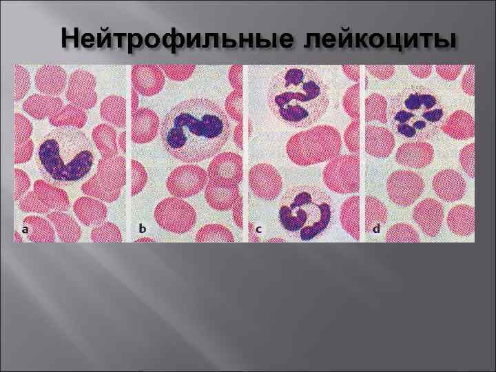 Нейтрофильные лейкоциты Размеры 10 -12 мкм. Продолжительность жизни 8 суток. Нейтрофил содержит несколько митохондрий и большое количество гликогена. В зависимости от степени дифференцировки различают палочкоядерные и сегментоядерные нейтрофилы. Содержание в крови палочкоядерных 2 -5%, а сегментоядерных форм 43 -59 %.