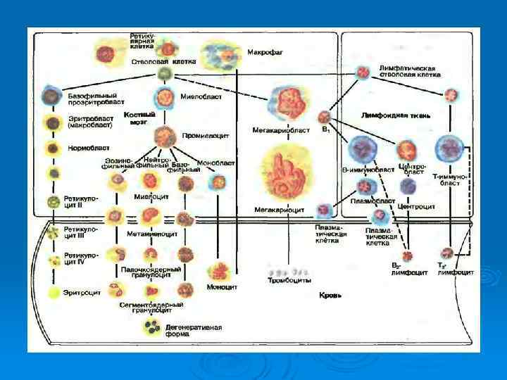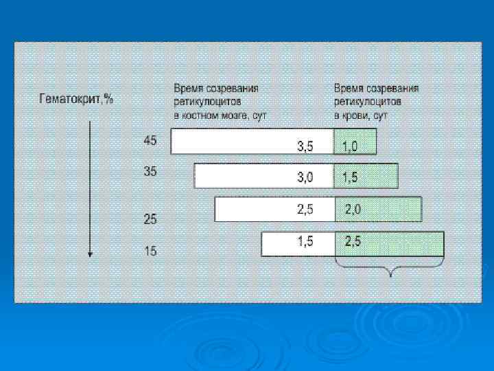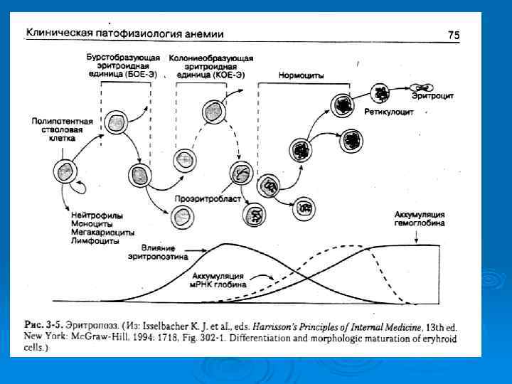 Эритропоэтин основной регулятор эритропоэза стимулирует образование эритроцитов из поздних клеток предшественников и повышает выход ретикулоцитов из костного мозга. Синтез глобиновой м. РНК начинается со стадии проэритробласта/базофильного эритробласта. На стадии полихроматического эритробласта начинается накопление гемоглобина