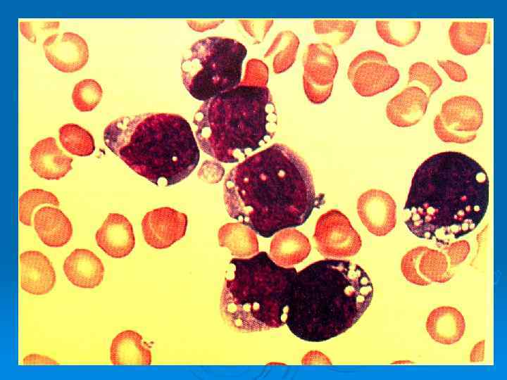 Проявления ХМЛ В развернутую стадию: как правило, развивается незаметно, поэтому у многих больных его выявляют случайно, в ходе профилактического осмотра. Ø Терминальная стадии слабость, утомляемость , похудание , спленомегалиея, частые инфекции , тромбозы или кровоточивость , обусловленные нарушением функции нейтрофилов и тромбоцитов. Ø