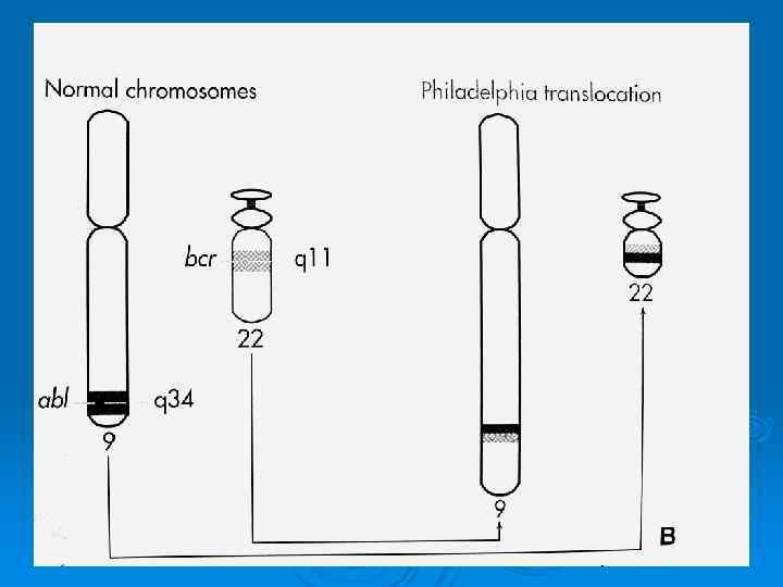 Хронический миелолейкоз Опухолевое заболевание при котором субстратом опухоли служат морфологически зрелые клетки миелоидного ряда являющиеся потомками единственной стволовой клетки, как правило (в 98%), несущей реципрокную транслокацию между длинными плечами 9 й и 22 й хромосом.