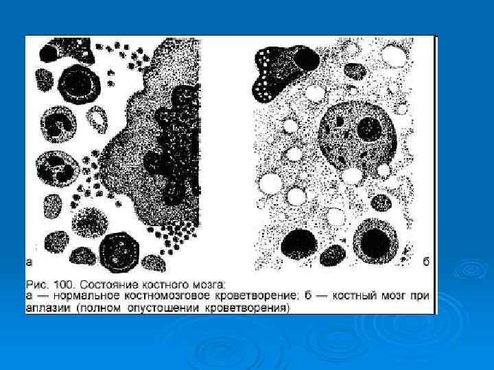 Апластическая анемия Для диагностики апластической анемии необходимо проведение дополнительных исследований: Ø Аспирационная биопсия костного мозга (цитологическое исследование) Ø Трепанобиопсия костного мозга (гистологическое исследование) Ø Цитогенетическое исследование клеток костного мозга и периферической крови Основные патогенетические механизмы : Ø аутоиммунный процесс Ø приобретенный дефект стволовых клеток
