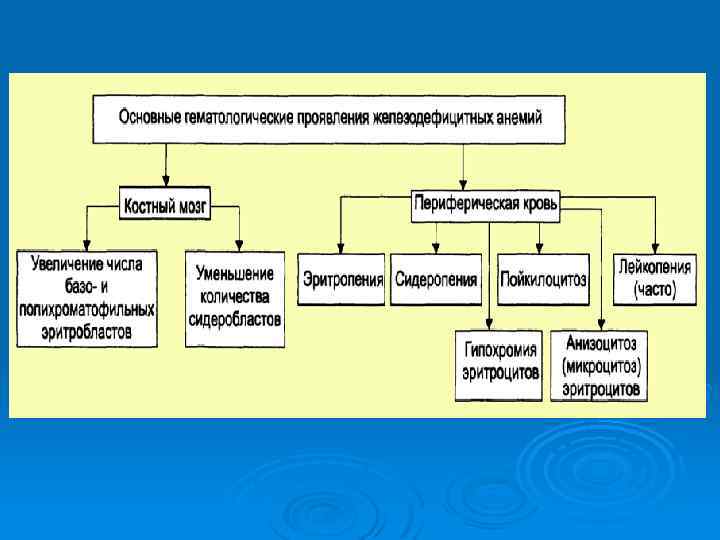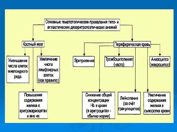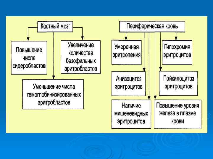 ЖЕЛЕЗОРЕФРАКТЕРНАЯ АНЕМИЯ Ø Причина: В костном мозге нарушается включение железа в молекулу гема и синтеза гемоглобина – увеличение железа в плазме и клетках различных органов. В костном мозге увеличиваются содержание сидеробластов