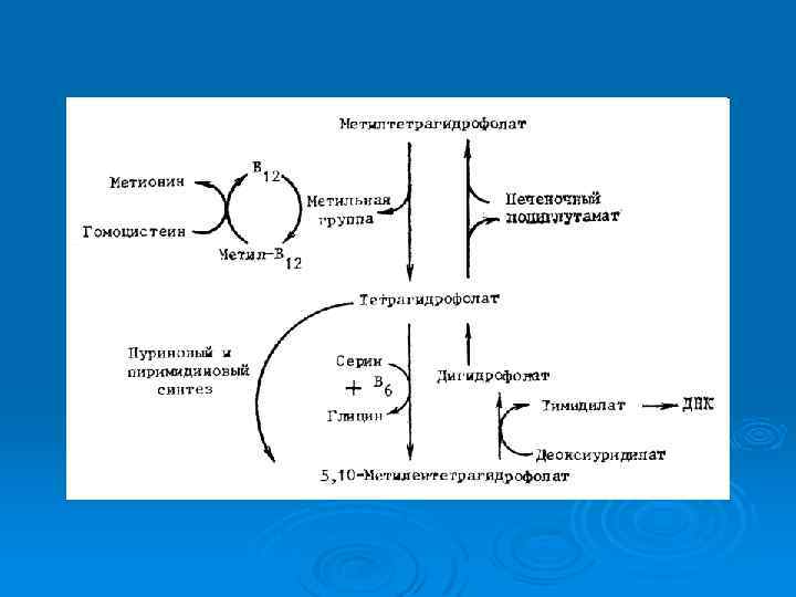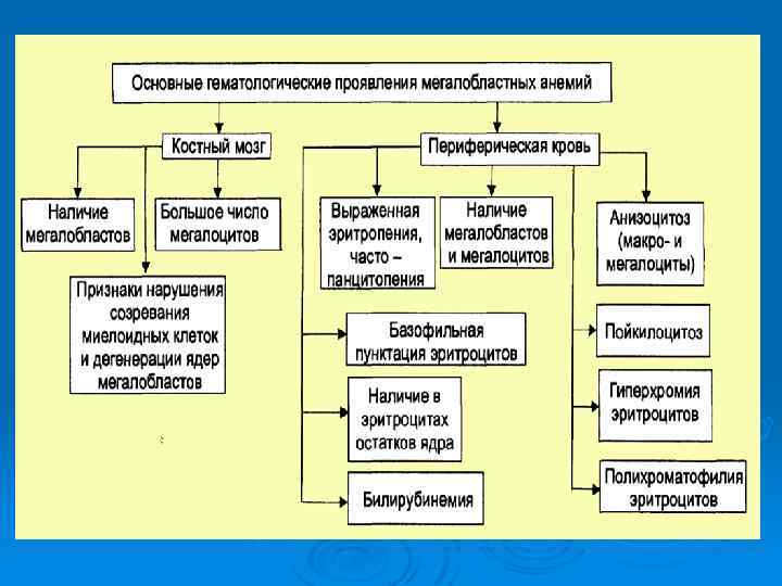 В 12 -ФОЛИЕВО-ДЕФИЦИТНЫЕ АНЕМИИ Причина: дефицит витамина В 12 и фолиевой кислоты Ø Механизмы развития: Снижение синтеза пуриновых и пиримидиновых оснований, превращение рибозы в дезокси рибозу, замедление деления и созревания клеток, увеличение размеров клеток за счет избыточного гемоглобинизирования Усиление процессов внутрикостномозгового разрушения клеток до 50% при норме 20% Укорочение время жизни циркулирующих макроцитов в 3 4 раза Ø Основные принципы профилактики и лечения Диетическое питание. Заместительная терапия препаратами витамина В 12 (цианкобаламин и др. ) Ø
