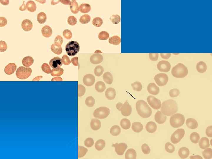 Эритроциты – 1, 4 х1012 Эритроциты – 2, 5 х1012 Ретикулоциты – 0. 1 o/oo Ретикулоциты – 4 o/oo Гемоглобин – 30 г/л Гемоглобин – 110 г/л Цветовой показатель – 0, 9 Цветовой показатель – 1, 2 Лейкоциты – 2, 8 х109 В мазке макроциты и мегалоциты, Тромбоциты – 100 х109 тельца Жолли В костном мозге преобладает жировая ткань Эритроциты – 2, 5 х1012 Ретикулоциты – 12 o/oo Гемоглобин – 130 г/л Гематокрит – 35 – 50 % Цветовой показатель – 0, 90 Лейкоциты – 3, 8 х109 СОЭ – 5 мм/час Тромбоциты –
