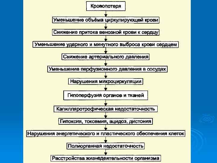 Проявления острой кровопотери Объем кровопотери Признаки Данные физикального исследования Процент мл ОЦКа <20 < 1000 Беспокойство Возможна вазовагальная реакция 20 -30 10001500 Тревожность, одышка при нагрузке Ортостатическая гипотония, тахикардия при нагрузке 30 -40 15002000 Обморок при переходе в положение стоя или сидя Ортостатическая гипотония, тахикардия в покое >40 >2000 Спутанность сознания, одышка Шок, ишемия тканей а Из расчета, что ОЦК составляет 5000 мл (у взрослого весом 70 кг).