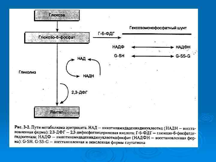 Ферментопатии эритроцитов АТФ образуется в процессе анаэробного гликолиза и уходит главным образом на обеспечение работы Na+, K+-АТФазы, поддерживающей ионный состав эритроцита. Небольшое количество энергии идет на сохранение железа гема в восстановленной форме и, по-видимому, на обновление липидов мембраны. Примерно 10% глюкозы, метаболизируетс я по пентозофосфатн ому пути. Он обеспечивает защиту гемоглобина и мембраны эритроцита от экзогенных окислителей