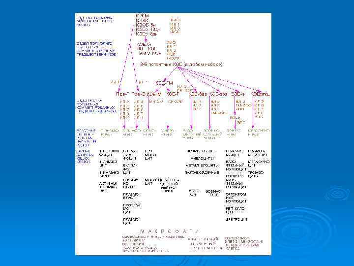 Основные факторы дифференцировки • Интерлейкин-3 (ИЛ-3) – ростовой и дифференцирующий фактор для наиболее ранних предшественников кроветворных клеток ИЛ-3 стимулирует пролиферацию и дифференцировку промежуточных клетокпредшественников, а также дифференцировку поздних клетокпредшественников в мегакариоциты, гранулоциты, моноциты и эритроциты. • ГМ-КСФ – стимулирует дифференцировку поздних клетокпредшественников в нейтрофилы, эозинофилы и моноциты. Кроме того, он стимулирует пролиферацию промежуточных клетокпредшественников. • Г-КСФ – является основным гемопоэтическим фактором роста, который обеспечивает пролиферацию, дифференцировку и терминальное созревание миелоидных предшественников нейтрофильных гранулоцитов, а также стимулирует разнообразные функции зрелых нейтрофилов и увеличивает продолжительность их жизни. • Интерлейкин-7 (ИЛ-7) - ростовой и дифференцирующий фактор для пре -В и пре-Т лимфоцитов
