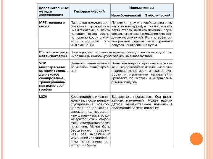 ДИАГНОСТИКА МРТ предпочтительнее для выявления участков ишемии, оценки распространённости ишемического повреждения и пенумбры (это особенно важно в первые 12— 24 часа заболевания, когда методом КТ ишемический инсульт может не визуализироваться). При недоступности КТ или МРТ необходимо выполнить эхоэнцефалографию и люмбальную пункцию.