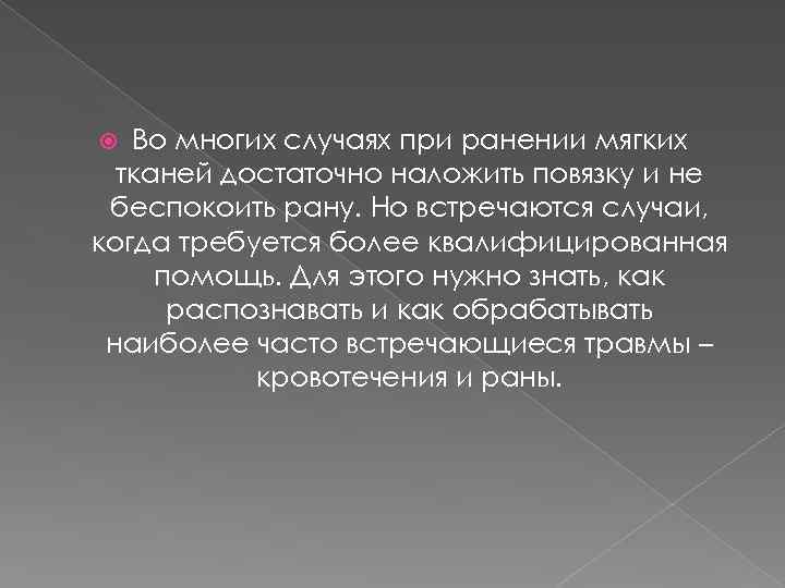 Во многих случаях при ранении мягких тканей достаточно наложить повязку и не беспокоить рану. Но встречаются случаи, когда требуется более квалифицированная помощь. Для этого нужно знать, как распознавать и как обрабатывать наиболее часто встречающиеся травмы – кровотечения и раны.