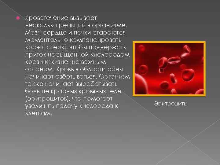Кровотечение вызывает несколько реакций в организме. Мозг, сердце и почки стараются моментально компенсировать кровопотерю, чтобы поддержать приток насыщенной кислородом крови к жизненно важным органам. Кровь в области раны начинает свёртываться. Организм также начинает вырабатывать больше красных кровяных телец (эритроцитов), что помогает увеличить подачу кислорода к клеткам. Эритроциты