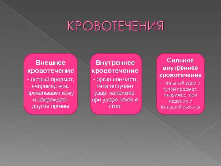 КРОВОТЕЧЕНИЯ Внешнее кровотечение - острый предмет, Внутреннее кровотечение - орган или часть например нож, прокалывает кожу и повреждает другие органы тела получает удар, например, при ударе ногой о стол. Сильное внутреннее кровотечение - сильный удар о тупой предмет, например, при падении с большой высоты