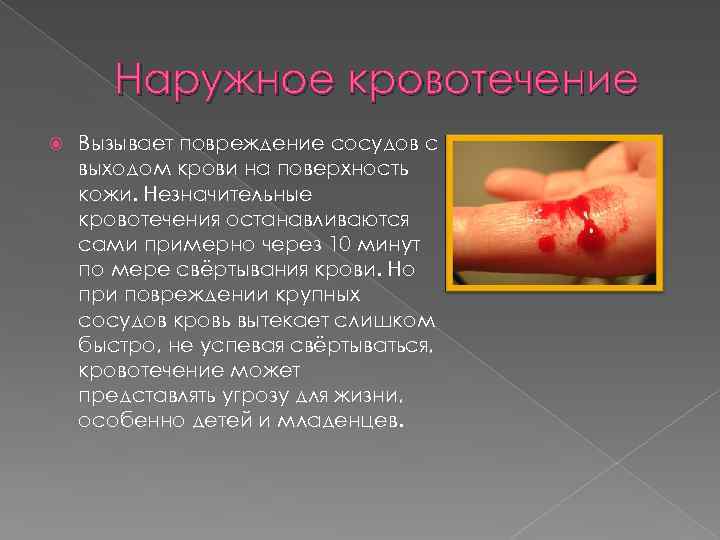 Наружное кровотечение Вызывает повреждение сосудов с выходом крови на поверхность кожи. Незначительные кровотечения останавливаются сами примерно через 10 минут по мере свёртывания крови. Но при повреждении крупных сосудов кровь вытекает слишком быстро, не успевая свёртываться, кровотечение может представлять угрозу для жизни, особенно детей и младенцев.
