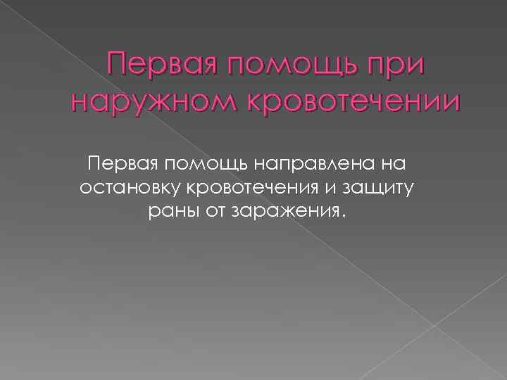 Первая помощь при наружном кровотечении Первая помощь направлена на остановку кровотечения и защиту раны от заражения.