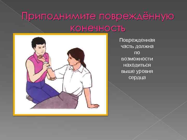 Приподнимите повреждённую конечность Поврежденная часть должна по возможности находиться выше уровня сердца