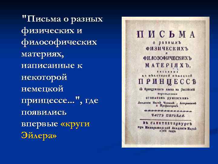 "Письма о разных физических и философических материях, написанные к некоторой немецкой принцессе. . . ", где появились впервые «круги Эйлера»