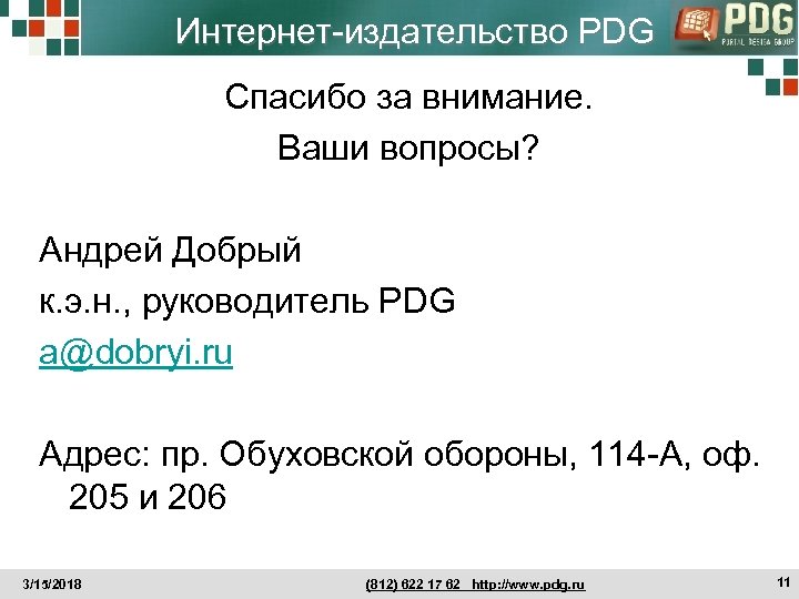 Интернет-издательство PDG Спасибо за внимание. Ваши вопросы? Андрей Добрый к. э. н. , руководитель PDG a@dobryi. ru Адрес: пр. Обуховской обороны, 114 -А, оф. 205 и 206 3/15/2018 (812) 622 17 62 http: //www. pdg. ru 11