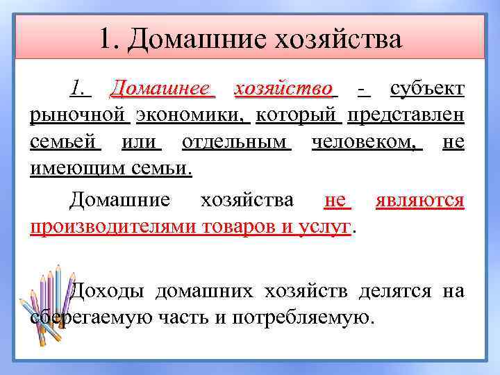 1. Домашние хозяйства 1. Домашнее хозяйство - субъект хозяйство рыночной экономики, который представлен семьей или отдельным человеком, не имеющим семьи. Домашние хозяйства не являются производителями товаров и услуг. Доходы домашних хозяйств делятся на сберегаемую часть и потребляемую.