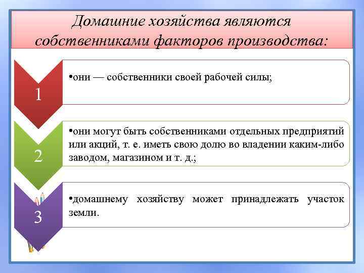 Домашние хозяйства являются собственниками факторов производства: • они — собственники своей рабочей силы; 1 2 3 • они могут быть собственниками отдельных предприятий или акций, т. е. иметь свою долю во владении каким-либо заводом, магазином и т. д. ; • домашнему хозяйству может принадлежать участок земли.