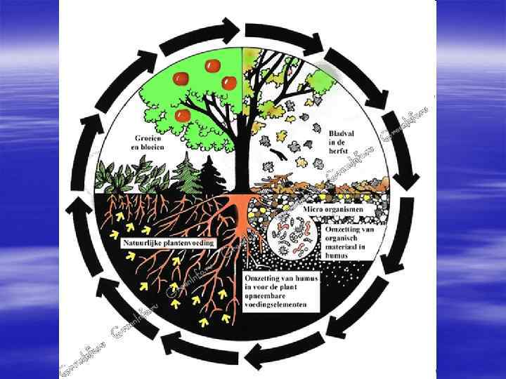 Круговорот углерода В процессе фотосинтеза углекислый газ атмосферы и гидросферы ассимилируется наземными и водными растениями, а также цианобактериями и превращается в углеводы. В процессе же дыхания всех живых организмов происходит обратный процесс: углерод органических соединений превращается в углекислый газ Цианобактерии
