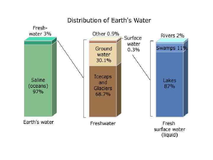 Круговорот воды • Море теряет из-за испарения больше воды, чем получает с осадками; на суше положение обратное. • Установлено, что во многих областях 90% осадков приносится с моря. • Согласно оценкам, вес воды пресных озер и рек - 0, 25 геограмма (1 геограмм=1020 г), а годовой сток - 0, 2 геограмма; следовательно, время оборота составляет около года. • Увеличение стока в результате деятельности человека может уменьшить очень важный для круговорота фонд грунтовых вод.