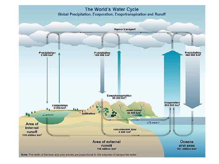 Круговорот воды • Самый значительный по переносимым массам и по затратам энергии круговорот на Земле. • За год вовлекается всего 0, 04% массы гидросферы, но это соответствует 16, 5 млн. м 3 воды за секунду и более 40 млрд. МВт солнечной энергии. • Речной сток составляет только 7% глобального гидрологического цикла.