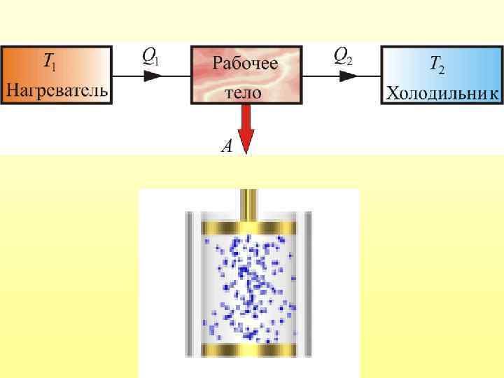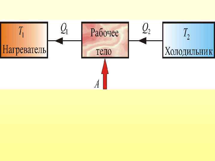 От термостата с более высокой температурой Т 1, называемого нагревателем, за цикл отнимается количество теплоты Q 1, а термостату с более низкой температурой Т 2, называемому холодильником, за цикл передается количество теплоты Q 2 и совершается работа A: