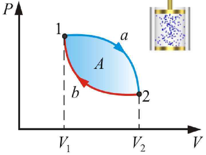 Цикл, совершаемый идеальным газом, можно разбить на процессы: расширения (1 – 2) сжатия (2 – 1) газа Работа расширения (1 a 2 V 2 V 11) положительна (d. V >0) Работа сжатия (2 b 1 V 1 V 22) отрицательна (d. V < 0). Работа, совершаемая за цикл, определяется площадью, охватываемой кривой