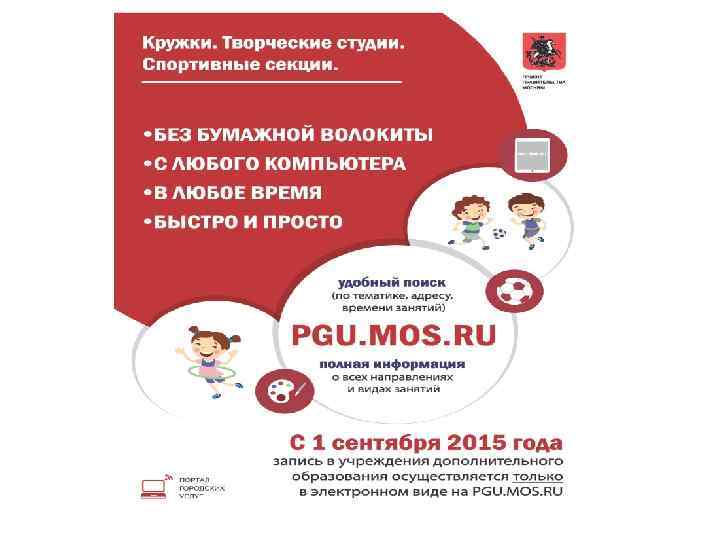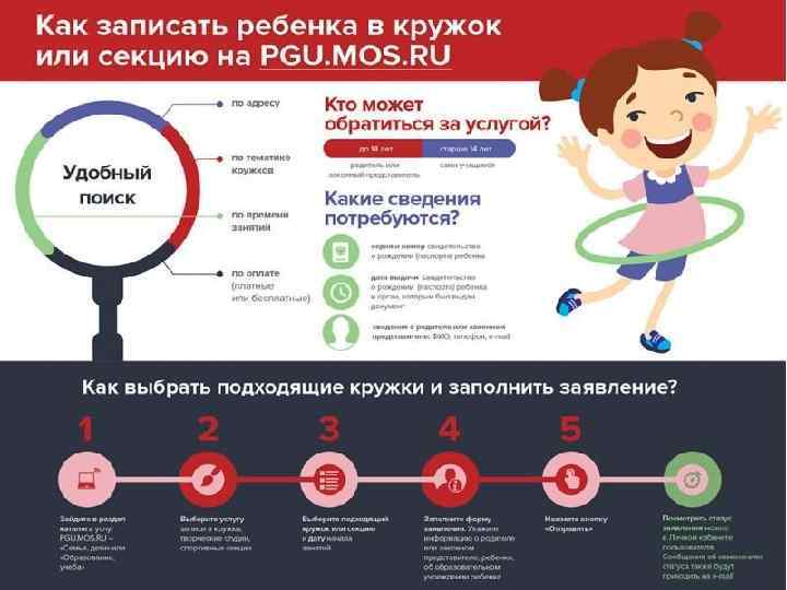 • • • Узнать обо всем многообразии дополнительных общеобразовательных программ в Москве и записать ребенка в кружок, студию или секцию Вы можете, не выходя из дома, с любого компьютера или мобильного устройства на Портале государственных услуг города Москвы. Записать ребенка в кружок на Портале городских услуг Москвы могут родители (законные представители), ученики в возрасте старше 14 лет имеют возможность записаться самостоятельно. Документы и сведения, необходимые для электронной записи: серия и номер свидетельства о рождении (паспорта) ребенка; дата и орган выдачи свидетельства о рождении (паспорта) ребенка; сведения о родителе (законном представителе) — Ф. И. О. ; телефон; адрес электронной почты; При оформлении электронного заявления Вы можете выбрать кружок, время и место занятий. Информация о статусе заявления будет размещена в Вашем личном кабинете на Портале государственных услуг города Москвы. Также Вы будете получать уведомления об изменении статуса заявления по электронной почте.