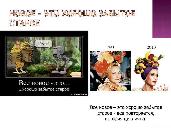 Из мемуаров (1824) Розы Бертэн, личной портнихи французской королевы Марии. Антуанетты. Однажды она, слегка подновив старое платье Королёвы, предложила его королеве, и та с удовольствием его приняла. «Новое — это хорошо забытое старое» , — прокомментировала этот случай портниха. Что-то может быть воспринято как новое только потому, что оно была хорошо забыто.