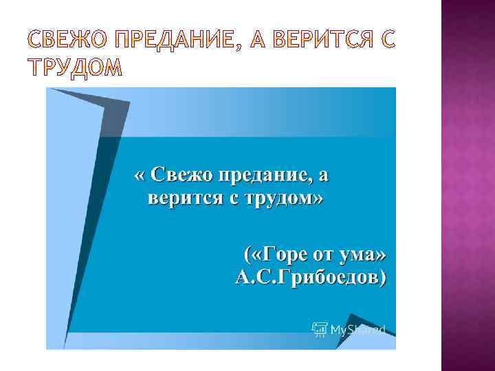 Выражение из произведения Александра Сергеевича Грибоедова «Горе от ума» (1824). Слова Чацкого (действ. 2, явл. 2): Как посравнить, да посмотреть Век нынешний и век минувший: Свежо предание, а верится с трудом. Значение: о какой либо истории, которая свершилась недавно, но кажется неправдоподобной; о недостоверной истории. Слово "предание" означает рассказ, поверье, переходящее от одного поколения к другому в устной передаче (Толковый словарь Д. Н. Ушакова, 1935 -1940).